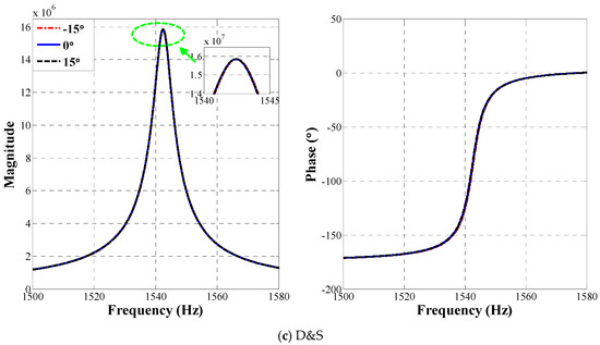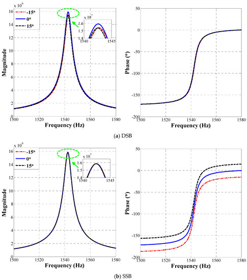 Figure 6a enlarges the image in Figure 5a, which is one of the magnitude characteristics in the neighbourhood of the drive-mode resonant frequency (1542.5 Hz) in the DSB system. As the magnitude-frequency curve shows, the change in magnitude owing to the ±15° phase variations is calculated to be more than 3%. Figure 6b enlarges the image of the phase characteristics in the neighbourhood of the drive-mode resonant frequency (1542.5 Hz) in SSB system. As the phase-frequency curve shows, the change of resonant phase owing to the ±15° phase variations is calculated to be around 15°.