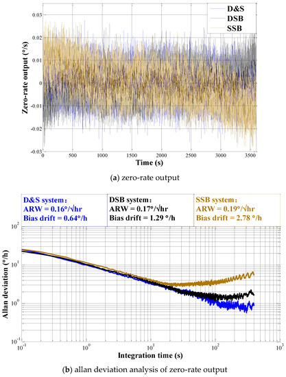 Zero-rate output tests for the gyroscope using each of the three configurations is shown in Figure 8. The gyroscope output is collected at room temperature for 1 h with the sampling frequency of 10 Hz. The bias instability in D&S system is measured to be 0.64°/h (improved by 2 times than DSB and 4.3 times than SSB) at the longest integration time than in the other two systems. The angle random walk (ARW) in D&S system is measured to be 0.16°/h, which is similar to that of DSB and is slightly smaller than that of SSB. This makes sense because the amplitude information using D&S or DSB share the same signal processing architecture and information carried in both sidebands of the capacitive modulated signal are extracted while SSB only uses information from one sideband. Allan deviation analysis shows that the ramp at long averaging time is effectively reduced using D&S configuration compared to that using DSB or SSB, which is due to phase error robustness and thus the reduced quadrature error leakage into the angular rate channel using D&S configuration.