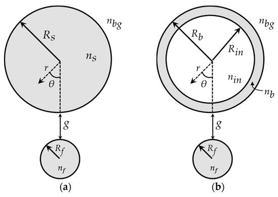 In Figure 2, the cross-sections of two different kinds of optical spherical microresonators, coupled to a tapered fiber, are shown. The developed analytical model found the electromagnetic (e.m.) fields of the microresonators and the fiber by solving the Helmholtz equation in spherical and cylindrical coordinates, respectively. In particular, the e.m. fields of the microresonators are described by the well-known WGM theory [20]. Then, the coupled-mode theory allows for modeling the optical interaction between the calculated microresonator modes and fiber modes [21].