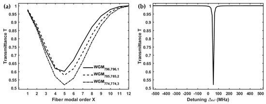 Figure 3a shows the transmittance T of the microsphere-based setup, calculated for three different , as a function of the radial order X of the cladding modes, considering a gap g = 0 nm (i.e., taper and microsphere in mechanical contact, as in [15]). The lowest transmittance dip, which corresponds to the highest coupling with the microsphere, can be attained for the by exciting with the fiber cladding mode through the LPG. The resonance of the , expressed in terms of the detuning , is shown in Figure 3b. The simulated results are in good agreement with the experiment reported in [15]. In fact, by exciting the , the simulated transmittance of the microsphere-based coupling system reaches a minimum of T = 0.52, while, in the experiment, the measured transmittance is about T = 0.65. The small discrepancy can be explained by considering that the actual total losses are higher. However, it is worth nothing that, in Figure 3a, the transmittance simulated for the coupled with the is T = 0.66, practically coincident with the measured transmittance [15], for the same fiber modal order.