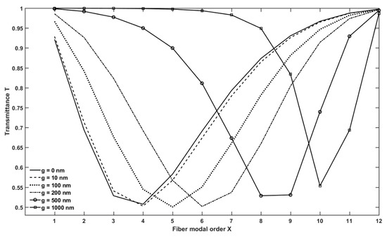 Figure 6 shows the transmittance T of the microbubble-based setup, calculated for the gap values, g = 0, 10, 100, 200, 500, 1000 nm. For each value of g, the transmittance due to the , which exhibits the lowest dip among the coupled WGMs, is plotted as a function of the radial order X of the fiber modes. In this case, the transmittance is predominant with respect to the contribution of the other WGMs. As in the microsphere case, except for large gap values (g = 1000 nm), the simulated minimum transmittance is almost the same in all cases, while the radial order of the fiber modes slightly increases as the gap increases. It is worthwhile noting that, in Figure 4 and Figure 6, the critical coupling condition can be achieved by considering different fiber optic modal order.