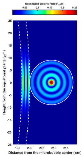 where k = ω is the wave vector in vacuum, is the refractive index of the microsphere (Figure 2a) and is the electric or magnetic field component. If the polarization of the e.m. fields is supposed to be constant throughout all points in space, the solutions of Equation (1) can be expressed in the following form [20]: