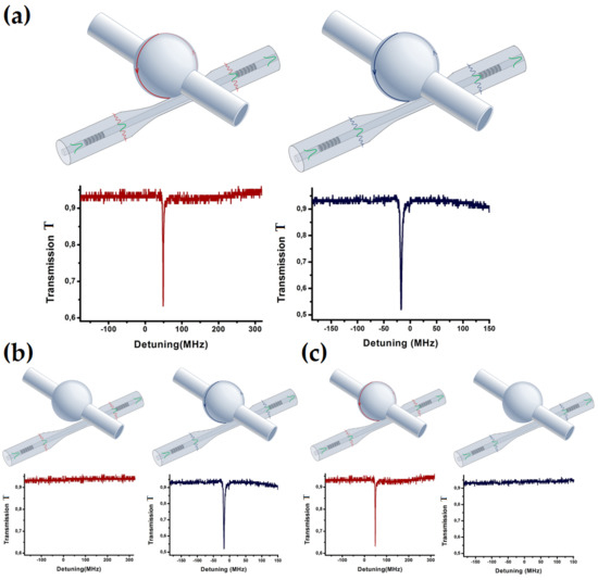 (a) Sketch and results of two in-series coupling systems with both the microresonators (microspheres in this case) coupled to each tapered fiber. The corresponding resonances achieved by scanning a laser source around the resonant wavelengths of the LPGs (0 MHz detuning) are also detailed below each sketch. The other two cases are shown to prove the zero cross-talk of the approach proposed; (b) the second microsphere is in contact, while the first is not; (c) the first microsphere is in contact, while the second is not.