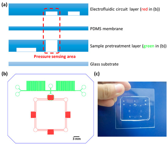 (a) The layer-by-layer scheme of the microfluidic chip (side view). (b) The sample-pretreatment layer (green) and the electrofluidic circuit layer (red) of the microfluidic chip (top view). (c) A picture of the microfluidic chip. PDMS—polydimethylsiloxane.