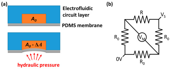 (a) The hydraulic pressure deforms the PDMS membrane. (b) The electrofluidic Wheatstone bridge.
