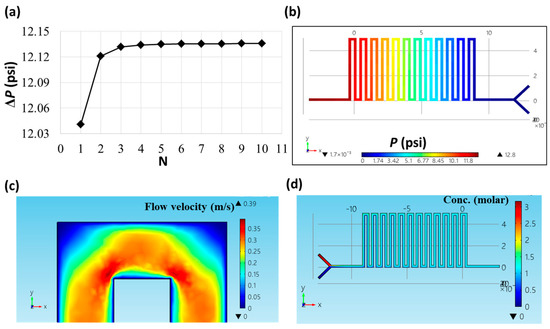 The pressure drop between the inlets and the pressure transduction hole was calculated using the Fortran language. In Equation (7), for values of N larger than 5, ΔP was constant and close to 12.135 psi under a flow rate of 100 μL/min, as shown in Figure 3a. In the COMSOL simulation indicated in Figure 3b, the pressure drop was around 12.8 psi (the difference in hydraulic pressures between the leftmost, dark-red area and the right-most, blue area). This value was slightly (~5%) higher than that calculated using Fortran. Figure 3c shows the flow velocity around one corner of the microfluidic channel. Liquids tended to flow along the inner corner of the channel, leading to an increase in flow resistance and pressure drop compared with the assumed straight channel in Equation (7). The sample mixing process was also simulated using the COMSOL software. In Figure 3d, by flowing two solutions with concentrations of 0 and 3 M into the two inlets at the same flow rates, a uniform solution with a concentration of about 1.5 M was obtained in the outlet.