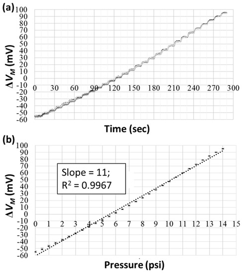 To investigate the pressure-sensing performance, nitrogen gas was introduced into the microfluidic channel to deform the PDMS membrane. This gas was supplied from an N2 gas cylinder and regulated via a pressure controller. The gas pressure was controlled to increase from 0 to 14 psi at an increment of 0.5 psi, and the waiting time between two pressure values was 10 s, much longer than the responding time of the pressure controller. The measured voltage differences from five successive measurements are shown in Figure 4a, indicating linear responses and good repeatability. The average values with standard deviations (over the last 5 s for each gas pressure and over five measurements) were plotted against the gas pressure, as shown in Figure 4b. An offset voltage difference of around −60 mV was recorded at zero pressure. From linear fitting, a slope of 11 mV/psi indicated that a pressure of 1 psi will lead to an 11-mV measured voltage difference. Moreover, the good linearity (R2 = 0.9967) verified the applicability of the present device for pressure and viscosity measurements. By inserting ΔVM = 152.6 mV and VS = 5 V into Equation (6), the resistance change ΔR under a gas pressure of 14 psi was about 12.2% of the original value.