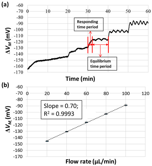 It follows that the hydraulic pressure (PH), and thus, the pressure drop (ΔP) are proportional to the measured voltage difference (ΔVM). Next, the flow resistance (Rflow) is proportional to the pressure drop along the microfluidic channel (ΔP), the flow rate of the liquid sample (Q), the fluidic viscosity (μ), and the dimension of the channel (w: width; h: height; L: length) as [25]