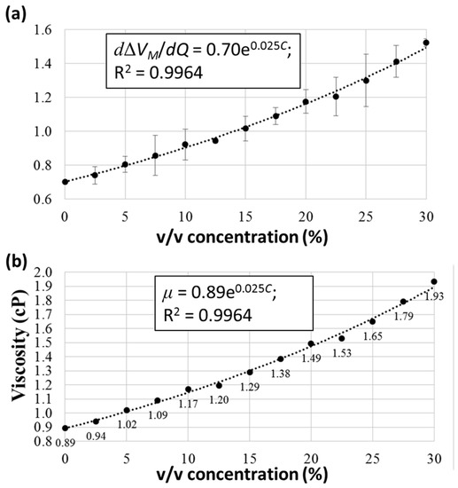 Glycerol solutions of different concentrations were obtained by flowing pure water and 30% v/v glycerol solution in water into the two inlets of the microfluidic channel at desired flow rates. For example, with a desired flow rate of 20 μL/min inside the channel, a concentration of 15% was achieved by injecting water and 30% glycerol solution at flow rates of 10 and 10 μL/min, respectively. A concentration of 2.5% was achieved by injecting water and 30% glycerol solution at flow rates of 18.3 and 1.7 μL/min, respectively. Thirteen samples, with concentrations ranging from 0% to 30% at an increment of 2.5%, were measured under flow rates of 20–100 μL/min and an increment of 20 μL/min inside the microfluidic channel. The average values of dΔVM/dQ with standard deviations (over three independent measurements) were plotted against the concentration, as shown in Figure 6a. Furthermore, by assigning a viscosity of 0.89 cP to 0% concentration (pure water), the viscosities at different concentrations could be obtained.