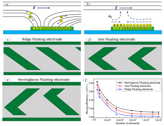 Before designing the micromixer, we first conduct a simulation analysis to investigate the flow behavior and explore the slip velocity on the polarizable conductive object deviated from the middle of two driving electrodes. As shown in Figure 1a, owing to electromigration, the charge carriers in the electrolyte follows the initial normal electric field component to the metal strip surface when the driving electrodes are energized [60]. When the EDL is fully charged, an induced double layer formed at the electrolyte/floating electrode surface. The ionic charge in the diffusion layer travel under the action of tangential component of electric field, resulting in an asymmetrical microstream (Figure 1b), which can be utilized for fluidic mixing under certain conditions. To investigate the effect of micro metal strip structure on the slip velocity, we exploit three types of floating electrodes, namely Ridge, Vee and herringbone floating electrodes, as illustrated in Figure 1c–e. The ICEO slip velocity on polarizable surfaces under AC forcing can be exploited to disturb the fluid interface between two neighboring streams. Generally, the faster slip velocity at the electrode can produce stronger flow disturbance, resulting in better mixing effect [55]. To make sure the credibility of the simulation results, a grid-independence test is carried out to determine the suitable number of elements [61]. Comparing the tetrahedral meshes with the hexahedral meshes, since the hexahedral meshes have better computational accuracy and faster convergence, the computational domain was completely covered by the hexahedral meshes. Eight different structured hexahedral grid models with an element number ranging from 7.85 × 103 to 1.52 × 105 are tested. The mixing efficiency is simultaneously calculated under different element numbers. As shown in Figure 1f, the mixing efficiency varies slightly with the increasing element numbers beyond 1.10 × 105. Therefore, a grid system with 1.10 × 105 hexahedral elements is selected as the suitable grid system in terms of the accuracy and efficiency of simulation. We can also see from Figure 1f that the mixing efficiency for the herringbone floating electrode is better than the Ridge and Vee type floating electrode when the inlet flow velocity and the bulk conductivity are set to be 500 μm/s and 0.001 S/m under the conditions of A = 5 V, f = 400 Hz. It can be ascribed to the higher transverse slip velocity generated above the herringbone floating electrode under certain conditions. Therefore, we choose the herringbone floating electrode microstructure for further investigation.
