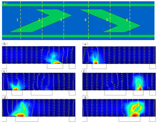 The fluid microstream at different cross section. (a) the definition of cross section 1–6; (b–d) the fluid motions on the left herringbone floating electrode at the cross section 1–3; (e–g) the fluid flow on the right herringbone floating electrode at the cross section 4–6.