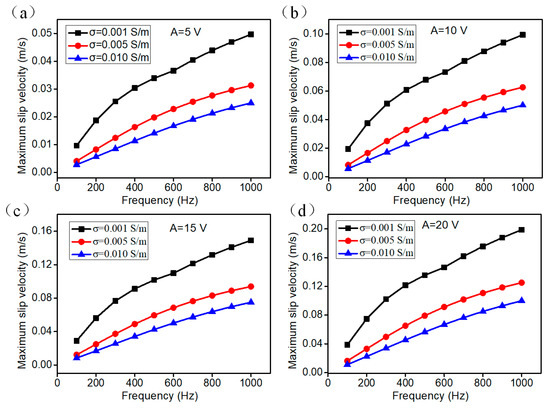 The electroosmotic flow velocity above the floating electrode surface plays an important role in enhancing the fluid-mixing efficiency. We quantificationally studied the frequency dependency of the electroosmotic slip velocity on the floating electrode under different bulk conductivities (Figure 4). The frequency dependency of the maximum slip velocity on the herringbone floating electrode under different buffer solution conductivities at A = 5 V is shown in Figure 4a. Evidently, the lower electrical conductivity (σ = 0.001 S/m) will induce larger slip velocity, and the higher ion concentration (σ = 0.01 S/m) will weaken the effect of the ICEO flow. The reason for that is the Debye screening thickness reduces with the increasing ion concentration, which results in the weakness of the ICEO electroconvective flow field. It is noticeable that the increasing rate of maximum slip velocity decay is obviously near the inverse RC time constant, f = 300 Hz. One reasonable explanation is that the IDL (Induced Double Layer) have enough time to be fully charged at the frequency lower than the ionic charge relaxation frequency as the ICEO slip velocity is proportional to the quadratic of electric field intensity applied (Equation (6)). When the voltage intensity increased to be 10 V, the maximum slip velocity is twice as large as it is at A = 5 V. Similarly, the lower ion concentration will induce larger slip velocity. When the voltage input is increased to 15 V, 20 V, the slip velocity is enlarged obviously (Figure 4c,d), engendering stronger ICEO vortex streaming for efficient mixing.