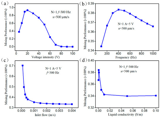 In this section, we make an attempt to explore the parametric effect on mixing behavior for engendering better performance by conducting simulation in the device with a pair of herringbone floating electrodes. Figure 5a) illustrates the relationship between the mixing performance and applied voltage amplitude at a fixed field frequency of f = 300 Hz while the inlet flow velocity is maintained at 500 μm/s. Owing to the complex configuration of the herringbone floating electrode, the ICEO slip flow generated on the entire electrode surface can be divided into the transverse and radial slip velocities. As the ICEO slip velocity at the solid/electrolyte interface has quadratic dependence on the electric field (Equation (6)), the ICEO transverse vortex flow can be utilized to enhance the convective flow and interface disturbance when the axial inlet flow velocity is constant. We can also see from the calculation results that the mixing performance increases with increasing amplitude ranging from 5 V to 20 V, which is in accordance with the theoretical prediction. However, mixing efficiency reaches the peak value at 20 V and diminishes with increasing voltage amplitude. In addition, the mixing efficiency becomes saturated to some extent at higher electric field strength above 80 V, exhibiting a poor mixing performance with increasing voltage amplitude. That could be ascribed to the influence of the radial slip velocity component, which could hinder the inlet fluids flowing into the microchannel and weaken the mixing efficiency when the axial ICEO flow is opposite to inflow direction and resembling the inlet flow velocity if the external electrical field exceeds a certain threshold. Field frequency is another important factor influencing ICEO convective slip velocity. The effect of varying field frequencies on the mixing performance is given in Figure 5b. At around 400 Hz, the mixing performance reaches a peak, whereas the maximum value is only 0.383. At high frequencies above 1000 Hz, the transverse weakened ICEO convective flow is not strong enough to transport the fluid quickly, which is not beneficial to fluid mixing. On the other side, mixing performance decays sharply with the increasing inlet fluid flow (Figure 5c). The reason behind this phenomenon is that the fluid samples have no sufficient time to interact with one another despite the disturbance of ICEO asymmetrical vortex pairs. It can be seen from the Figure 5d that the device has the greatest mixing performance when the electrical conductivity of the solution is 0.001 S/m. With the liquid conductivity increasing, the effect of ICEO is suppressed, resulting in the mixing performance beginning to decay and the mixing efficiency stabilizes at around 0.34.