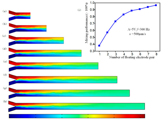 To accomplish efficient mixing, we also explore the mixing performance of the micromixer with different numbers of herringbone floating electrode pair sequentially configured on the microchannel bottom while the AC voltage amplitude is fixed at A = 5 V and the field frequency f = 300 Hz and inlet flow u = 500 μm/s. As exhibited in Figure 6, we can find that more herringbone floating electrode pairs can increase the opportunities of ICEO asymmetrical eddies to transfer the fluidic sample, enlarging the mixing region and improving sharply the mixing performance (Figure 6a–h). The quantitative relationship of mixing performance and the amount of herringbone floating electrode pairs is given in the Figure 6i. When the micromixer has five pairs of floating electrodes, the mixing performance can exceed 0.9. With the number of herringbone floating electrodes increases, the mixing percentage tends towards a steady state of around 0.96.