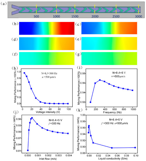 Parametric effect on mixing performance. (a–g) the concentration distribution at different cross section of channel at A = 5 V, f = 300 Hz, u = 500 μm/s. (b) The cross section at a range of 500 μm; (c) 1000 μm; (d) 1500 μm; (e) 2000 μm; (f) 2500 μm; (g) 3000 μm; (h) the voltage intensity effect on mixing performance at f = 300 Hz, u = 500 μm/s. (i) the frequency dependency of mixing performance at A = 5V, u = 500 μm/s; (j) the influence of inlet flow on mixing performance at A = 5 V, f = 300 Hz. (k) The relationship of mixing performance and liquid conductivity at A = 5 V, f = 300 Hz, u = 500 μm/s.