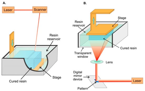 Stereolithography, or digital light processing, employs a photocurable polymeric resin which, when exposed to light, cures into a solid. Initially, curing was only possible with UV light, but polymers cured with visible wavelengths have recently been introduced. Highly focused lasers or LED beams with high intensity are used and the spot size of the light beam determines printing resolution []. Each layer of the object is printed as a point-by-point 2D cross section cured by the scanning focused beam onto a printing platform immersed in a photocurable tank that holds the liquid resin [] (Figure 2A). Recently, projection-based stereolithography has been introduced with a promise to decrease print time while maintaining almost the same resolution as line-based stereolithography. Projection-based stereolithography replaces point-by-point curing with entire-layer curing under one single UV or visible light exposure [,] (Figure 2B). Stereolithography resin materials have been extensively studied to produce devices with different properties, including transparency, color, flexibility and thermal stability []. Stereolithography has also been used for printing cells using biocompatible resins maintaining >90% cell viability after printing [].