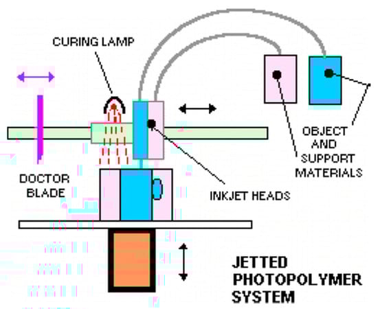 Schematic representation of multi-jet printing technique, a photocurable resin is printed simultaneously with a support material that can be removed after curing. Up to 10 printing heads can be used. Reproduced with permission from []. Copyright (2014) American Chemical Society.