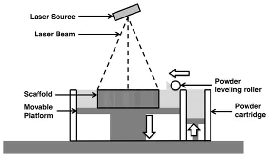 Schematic representation of Selective Laser Sintering, a rolling ball pushes powdered substrate to the surface of the printing platform. A high-energy focused laser beam scans the surface where it sinters the powder particles into a solid layer. The printing chamber is sealed under vacuum or inert gas atmosphere. Reproduced with permission from []. Copyright (2015) Springer Nature available under Creative Commons Attribution.