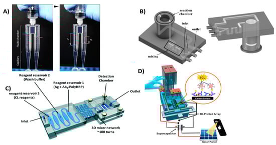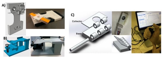 Versatility, ease of design and modification in a fast and economic manner made 3D printing the method of choice to develop the supporting equipment and pieces required for diagnostics. Shanmugam et al. used 3D printing to fabricate a custom designed mobile phone microscopy support unit. This unit perfectly aligns the sample compartment with simple optics and a mobile phone camera (Figure 10A) []. They also proposed a holder that can incorporate a microfluidic chamber for analyzing flowing samples rather than stationary samples (Figure 10B). Using such equipment, they were able to perform screening of soil-transmitted parasitic worms in resource-limited areas. Another supporting device for a paper-based electrochemical sensor was proposed by Scordo et al. []. A reagent-free sensor was proposed to test butyrylcholinesterase activity by detecting thiocholine. A 3D-printed support equipped with a sample application hole was used to provide the supporting strength and insulation required for electric connections (Figure 10C). Several 3D-printed supports for mobile phone-assisted diagnostics have been developed [,,], in addition to equipment pieces that can lower the cost of current diagnostic strategies [,,] without compromising performance.