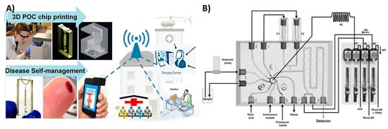 3D bioprinting is another emerging modification to traditional 3D printing where cells, enzymes or proteins may be encapsulated or loaded into printable bio-ink solutions []. A major focus of this technique is to provide cell growth medium for tissue and organ repair and regeneration, but it has also been explored as a tool for diagnostic applications []. Bioprinting offers an opportunity to fabricate 3D-printed implantable sensors that are biocompatible, geometrically complex, and cheap. With 3D printing, there is a limited need for specialized training, and devices can be tailored to the users’ requirements [,]. In this review, the most common techniques for 3D-printed diagnostics are briefly described with several examples of diagnostic platforms incorporating microfluidics, device supports, optical components, electronics and biomaterials.