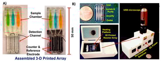 - Kadimisetty, K.; Song, J.; Doto, A.M.; Hwang, Y.; Peng, J.; Mauk, M.G.; Bushman, F.D.; Gross, R.; Jarvis, J.N.; Liu, C. Fully 3D printed integrated reactor array for point-of-care molecular diagnostics. Biosens. Bioelectron. 2018, 109, 156–163. [Google Scholar] [CrossRef] [PubMed]
