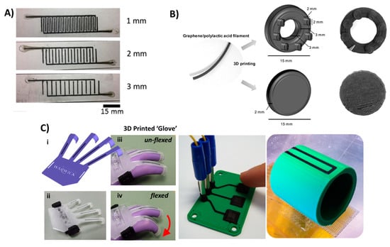 3D-printed electronics. (A) 3D-printed tactile electrode sensor. Conductive PDMS doped with carbon nanotubes were printed on PDMS or EcoflexTM to fabricate flexible electrode sensors. Reproduced with permission from []. Copyright (2018) IOP Publishing. (B) A 3D-printed graphene/polylactic acid electrode with ring or disc shape. Reproduced with permission from []. Copyright (2018) American Chemical Society. (C) A 3D-printed conductive carbon black electrode in different objects from left to right: flexible glove sensor, capacitive buttons and smart vessel. Reproduced from []. Copyright (2012) PLOS available under Creative Commons Attribution.