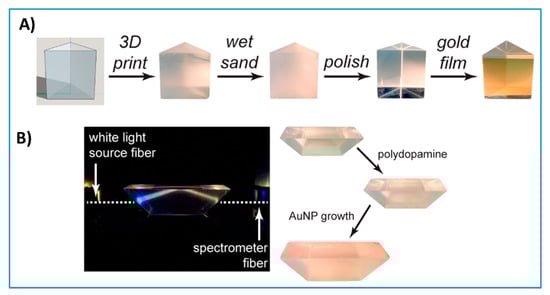 3D-printed optics. (A) 3D-printed prism polished with simple benchtop polishing decorated with a layer of gold and used for plasmonic sensing of cholera toxins. Reproduced with permission from []. Copyright (2017) American Chemical Society. (B) 3D-printed prism with a different geometry than (A) used to monitor nanoparticle growth. Reproduced with permission from []. Copyright (2017) American Chemical Society.