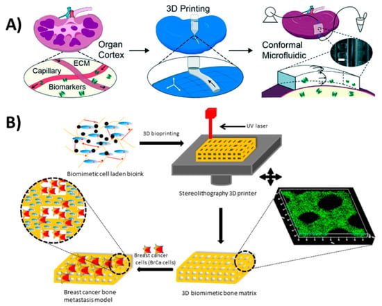3D bioprinting. (A) 3D-printed perfusion chip for extraction of metabolites and biomarkers from whole organs. Reproduced with permission from []. Copyright (2017) Royal Society of Chemistry (B) 3D-printed bone-like scaffold carrying bone stromal cells to study their interactions with breast cancer cells. Reproduced with permission from []. Copyright (2016) American Chemical Society.