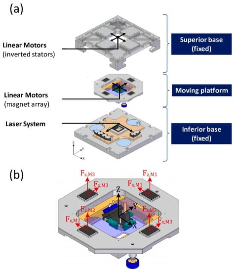 As shown in Figure 1a, the NanoPla consists of a three-layered architecture: an inferior and a superior base that are fixed, and a moving platform that is placed in the middle. Three air bearings lift the moving platform and levitate it. The planar motion is performed by four Halbach linear motors that are symmetrically assembled in an inverted position. In other words, the stators are fixed to the superior base, and the magnet arrays are assembled to the moving platform (see Figure 1a). The horizontal forces of each pair of parallel motors will move the platform in the X and Y direction, as Figure 1b shows. In addition, the vertical forces of the four motors will favour the levitation of the moving platform. A 2D laser interferometer system works as positioning sensor. The laser heads are fixed to the inferior base, and the mirrors are placed in the moving platform. In addition, in the NanoPla, a two-stage scheme has been applied. That means that the XY-long range positioning of the moving platform is complemented by an additional fine nanopositioning system for the more demanding scanning operations. This second stage is a commercial piezo-nanopositioning device with a working range of 100 × 100 × 10 μm3, which increases the number and variety of applications of the NanoPla.