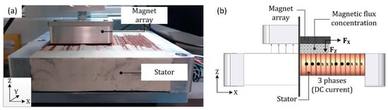 In a Halbach array of permanent magnets, the configuration of the magnets augments the magnetic field generated on one side and nullifies the magnetic field on the other side. That is, the rotating pattern of the permanent magnets forces the cancellation of magnetic components resulting in a one-sided flux. In a Halbach linear motor (Figure 2a), this flux is concentrated between the magnet array and the stator. When a DC current flows through the coils of the stator, these currents interact with the magnetic field of the magnet array. The electromagnetic interaction generates two orthogonal forces: one is horizontal (Fx) and the other is vertical (Fz), as can be seen in Figure 2b.