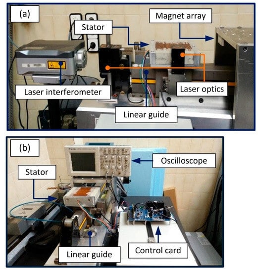 As can be observed in Figure 3, in this preliminary setup, the stator is the moving part while the magnet array is static, in contrast to the design of the NanoPla. Nevertheless, the relative motion between parts is the same in both cases. Therefore, this does not affect the design of the control system nor the experimental validation.