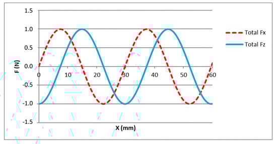In the system under study, the only forces that act on the motor are the orthogonal electromagnetic forces Fx and Fz, Fx being the only propulsion force that acts along the axis of movement. As mentioned in Section 3, when certain phase currents flow through the stator, Fx and Fz are generated, and their magnitude depends on the relative position between stator and magnet array. Figure 4 represents the sinusoidal shape of the horizontal force (Fx) and the vertical force (Fz) generated by certain phase current values along the axis of movement (xs).