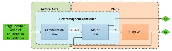 Thus, when the phase currents create a stable equilibrium state, the electromagnetic horizontal force acts as a controller, with the stable equilibrium position as the reference position. This system consists of the electromagnetic controller and the load elements of the plant, as represented in Figure 5. This electromagnetic controller does not require a positioning sensor.