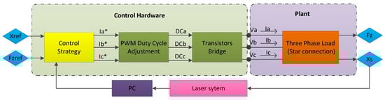 Figure 7 presents the control system implementation in the control hardware, having the laser system as positioning sensor. The control strategy reference inputs are the desired position (xref) and the vertical force (Fzref). The outputs are the required phase currents (Ia*, Ib* and Ic*). As already mentioned, the control hardware does not act directly on the phase currents. Instead, it generates phase voltages by PWM. Hence, the PWM modules must generate the phase voltages that correspond to those phase currents. The required DCs must be calculated for the transistor bridge to generate these phase voltages. The voltage drop between the phase terminals and the neutral point of the motor creates the phase currents (Ia, Ib and Ic). Thus, by the motor law, two orthogonal forces (Fx and Fz) are generated, and their magnitude depends on the relative position between the stator and the magnet array (xs). The motor position is measured by the laser system, and the readouts are extracted to the PC and directly sent to the control card through the SCI, together with the reference position command (xref). The control strategy is performed at the sampling speed of the positioning sensor. In this case, the fastest sampling speed of the laser system is 0.05 s.