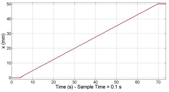 In order to confirm that the control system works along the travel range of 50 mm that is required in the NanoPla, the response to a 50 mm travel range input at a constant speed was recorded. As can be seen in Figure 9 the measured position (red line) follows the reference position (blue line) along the travel range, even doubling the sample time to 0.1 s.