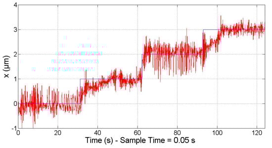 Besides this, the smallest step input that the motor can generate was also tested; that is, the minimum incremental motion. It must be noted that, in order to perform the motion, a change in the phase currents must occur. In turn, the variation of the phase currents is produced by a variation of the phase voltages that are controlled by the HRPWM module. As mentioned in the previous section, the minimum voltage variation that this module can perform is 2.62 × 10−5 V, which corresponds to a variation of approximately 2.62 × 10−5 A in the phase currents. Ideally, a change of this magnitude in the phase currents produces a displacement of approximately 600 nm. Nevertheless, the phase currents are also affected by the noise of the voltage source and the PWM signals. Therefore, the power stage is not able to work in the full range of the needed phase currents to perform a motion step in the submicrometre scale. However, the PID controller is fast enough to switch between two combinations of phase currents in order to reduce the positioning error, resulting in an improvement of the effective motion resolution. As shown in Figure 11, the system is able to respond to a staircase of 1 µm (reference position in blue and response in red). The magnitude of the positioning sensor measuring noise together with the resolution and noise of the voltage generation are the main contributors to the positioning noise of the control system. It must be taken into account that the laser system used for the experimental validation has a measuring noise in the range of 400 nm. In contrast, the laser system of the NanoPla has a measuring noise in the range of 20 nm. Therefore, better results are expected when the driving system is implemented in the NanoPla.