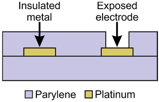 Cross section of a typical device showing insulated and exposed metal features, such as traces and electrodes, respectively.