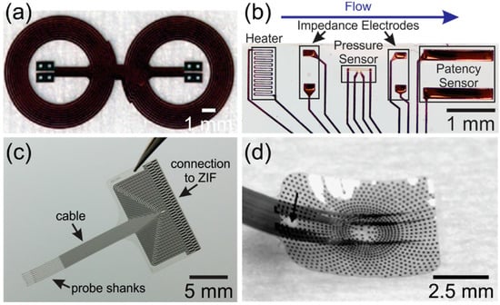 (a) Wireless coils (Reprinted from Reference [16] with permission from Elsevier); (b) flow, pressure and patency sensors to monitor hydrocephalus treatment (©2016 IEEE. Reprinted, with permission, from Reference [23]); (c) hippocampal neural probe array (©2017 IEEE. Reprinted, with permission, from Reference [37]); and (d) retinal prosthesis that matches the curvature of the eye (Reprinted from Reference [49] with permission from Elsevier). Parylene is transparent and the opaque features are metal.