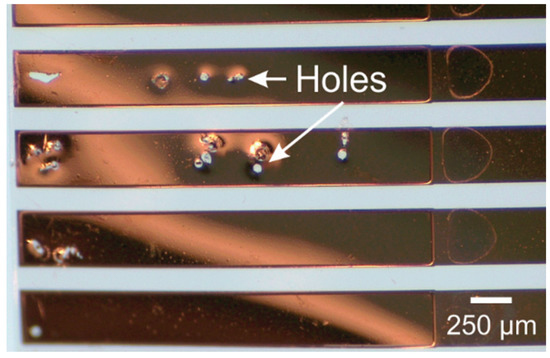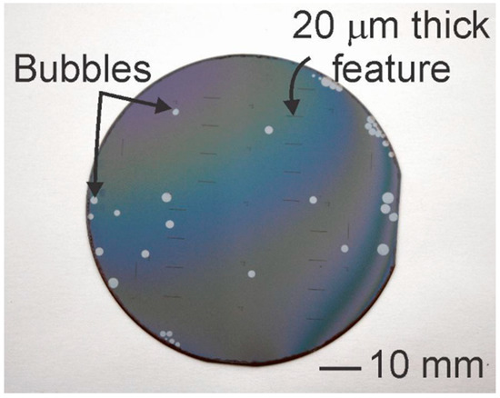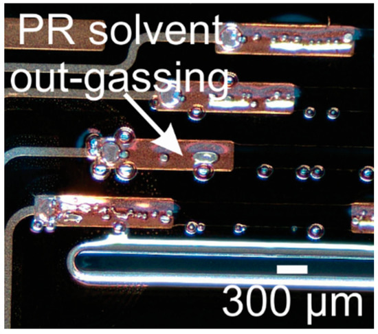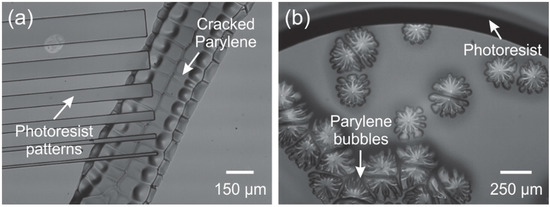 Photodegradation of Parylene has been reported in literature through a two-step process involving direct photolytic processes resulting in the formation of UV and IR absorbing structures, followed by photo-induced oxidation of the methylene groups and benzene ring [105]. It is also well known that UV radiation can deteriorate the thermal and electrical properties of Parylene films if the doses are large (>12 J/cm2) [106]. Although the small doses of UV exposure during lithography are unlikely to reach the threshold for full photodegradation, it is hypothesized that some combination of minor oxidation and mechanical/thermal stress may be responsible for the observed phenomenon when thick resist films are used. For example, bubbles between the Parylene and substrate may appear following the UV exposure step for photolithography (Figure 12). Piercing the Parylene bubbles in select non-critical areas and the use of a vacuum (after piercing) was found to aid in removal of the bubbles.