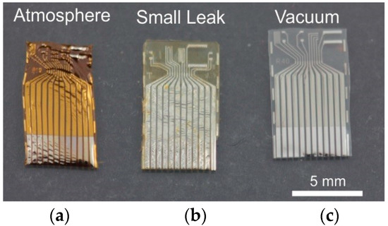 Thermal annealing is a common treatment for improving adhesion between Parylene-Parylene interfaces [55,56]. This process requires high temperature (>200 °C) compared to Parylene’s glass transition temperature and must be performed under vacuum to avoid the effects of oxidation (browning, wrinkling and becoming brittle) as shown in Figure 5.