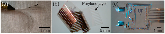 - Lee, C.D.; Meng, E. Mechanical properties of thin-film Parylene–metal–Parylene devices. Front. Mech. Eng. 2015, 1, 10. [Google Scholar] [CrossRef]
