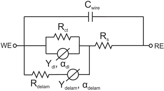Delamination at either the Parylene-Parylene or Parylene-metal interface can affect device performance well before catastrophic failure occurs. Many Parylene devices rely on insulated traces which terminate in exposed electrodes; delamination can alter this conductive pathway and lead to signal drift. These changes can be observed by monitoring the electrical/electrochemical impedance of an electrode and trace insulated in Parylene and immersed in water and understood using a modified Randles circuit model [80] (Figure 7). For a perfectly insulated electrode, the circuit consists of a solution resistance RS, charge transfer resistance Rct and a constant phase element Ydl to represent the double layer capacitance. Delamination presents an alternate conduction path from the electrode to the solution, with Rdelam representing resistance through the insulation and constant phase element Ydelam representing the capacitance through the insulation between electrode trace and electrolyte. A capacitance Cwire is also included to model parasitic capacitances within connecting cables, which causes a phase roll-off at high frequencies.