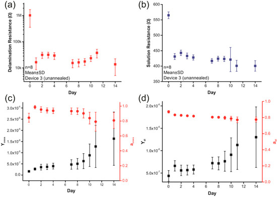 This model was confirmed using electrochemical impedance spectroscopy (EIS) data collected from platinum electrodes, coated and insulated with Parylene C films and soaked in 37 °C saline for 14 days (n = 8 electrodes) (Figure 8). All electrodes measured 300 × 1500 µm2 and were constructed from 2000 Å thick platinum insulated between 10 µm thick Parylene layers on the same die. EIS measurements were recorded between each electrode and a large platinum counter electrode using a Gamry Reference 600 potentiostat (Gamry Instruments, Warminster, PA, USA), with an Ag/AgCl electrode used as a reference. Modeling results show that both solution resistance and delamination resistance drop dramatically after only one day of soaking, while the interface capacitances gradually increase in magnitude over the testing period. The dramatic, two order-of-magnitude drop in delamination resistance may be due to either water penetration through the Parylene or the early stages of delamination and the small drop in solution resistance may be due to delamination around the exposed electrode, which would increase the electrode’s effective surface area.