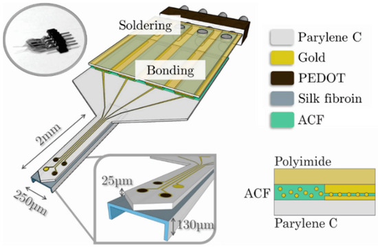 Schematic representation of a Parylene-based neural probe consisting of three PEDOT (poly(3,4-ethylenedioxythiophene))-nanostructured electrodes and one gold electrode as control. The device is anisotropic conductive film (ACF) bonded onto a flexible polyimide cable, which is then soldered onto a pin connector adapted to the wireless acquisition system. The cross-section shows bond pads from the device bonded via ACF to the bond pads of the polyimide cable. Reprinted from [88] with permission from Elsevier.