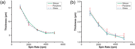 Spin curves for (a) AZ P4620 and (b) AZ 5214E-IR resists on silicon, glass and Parylene. Error bars represent standard deviation (n = 5).
