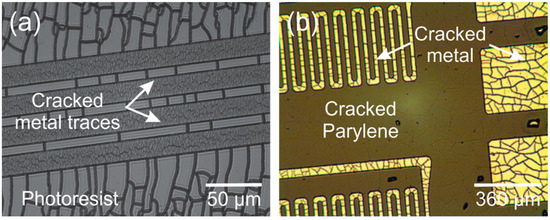 One of the most persistent challenges of Parylene is its limited thermal budget, a consequence of its thermoplastic nature; in atmosphere Parylene is subject to oxidation at temperatures greater than 100 °C, glass transition temperature around 90 °C and a melting temperature at 290 °C [10]. These temperatures are commonly encountered and even surpassed during standard silicon micromachining and electrical packaging. For example, during photolithography, photoresist must be soft-baked at elevated temperatures (100–120 °C) to remove residual solvent and exothermic reactions during the UV activation of the resist can generate temperatures of up to 200 °C [54]. Soldering, plasma etching, PVD and other methods common to micromachining require temperatures which can cause Parylene to burn, bubble, or crack (Figure 4).