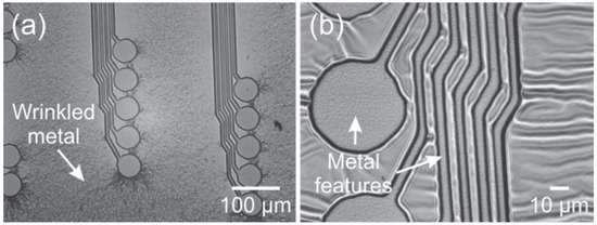 (a) Severe wrinkling/rippling seen in sputtered deposited platinum film results from compressive stresses of a higher magnitude; and (b) wrinkled areas around the device metal features.