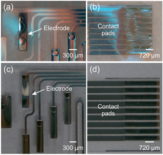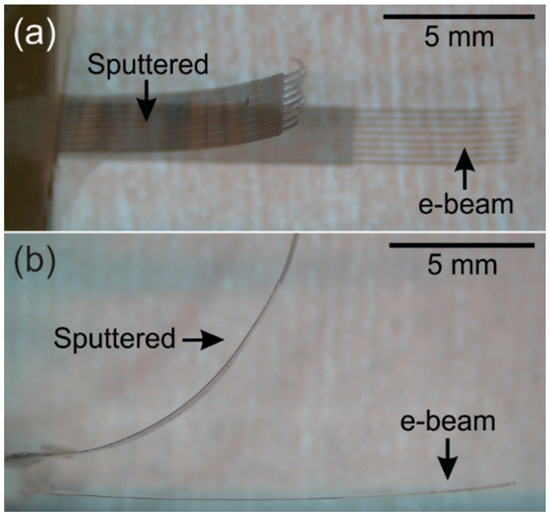 Figure 16 shows a micromachined Parylene-based neural probe array prepared with sputtered platinum. The high level of intrinsic stress (estimated as 510 MPa provided by LGA Thin Films, Santa Clara, CA, USA) forces the final device to curve severely, rendering it unusable. By comparison, the same devices are shown prepared with e-beam evaporated platinum, demonstrating reduced curvature.
