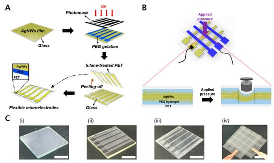 Silver nanowires of diameter 20–40 nm and length 20–30 μm were purchased from NANOPYXIS (Jeonju-si, Korea). Poly(ethylene glycol) diacrylate (PEG-DA; MW 575) and polyethylene terephthalate (PET; film thickness 0.175 mm) were purchased from Aldrich Chemicals (Gillingham, UK) and used without further purification. 4-(2-Hydroxyethoxy) phenyl-(2-hydroxy-2-propyl) ketone (Irgacure 2959) was purchased from BASF (Ludwigshafen, Germany). 3-Acryloxy-propyl trichlorosilane was obtained from Gelest, Inc. (Morrisville, PA, USA). Toluene and ethanol were purchased from Duksan Pure Chemicals Company Co., Ltd. (Ansan, Korea). Phosphate-buffered saline solution (PBS) was purchased from Life Technologies (Shanghai, China).