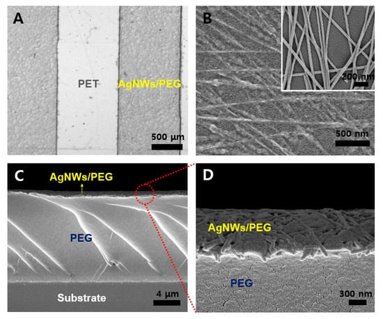 (A) Optical micrographs of AgNW-PEG patterns of line width 1 mm on PET. (B) FE-SEM micrographs of AgNW-PEG patterns on a PET substrate. (B inset) SEM micrograph of AgNW patterns on glass. (C,D) Cross sectional views of AgNW-PEG patterns of line width 1 mm on substrate.